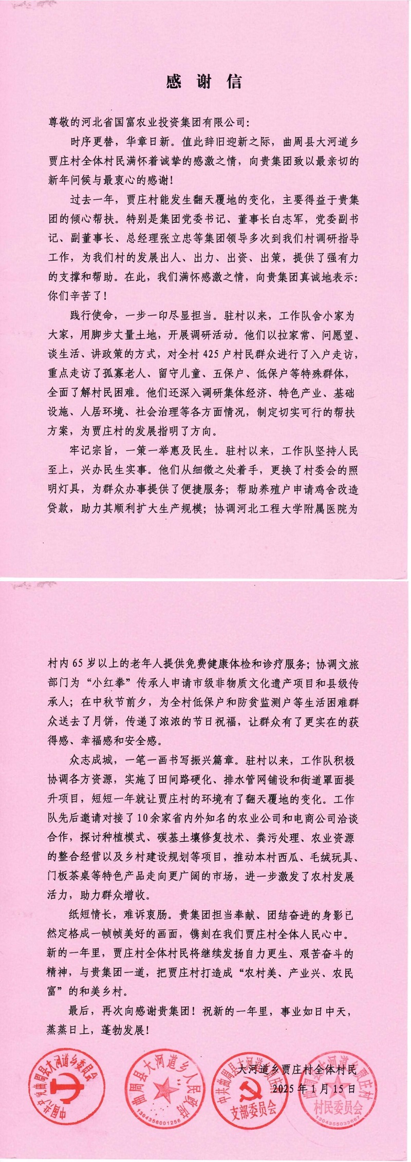 2024年,國富集團駐賈莊村下沉工作隊緊緊圍繞發(fā)展集體經濟、推進鄉(xiāng)村振興的目標,深入學習中央政策方針及省市縣委組織部和集團黨委有關下沉工作要求,扎實開展駐村幫扶工作,經過一年的努力,取得初步成效,同時也得到了曲周縣大河道鄉(xiāng)和賈莊村的認可,特給我集團送上錦旗和感謝信!